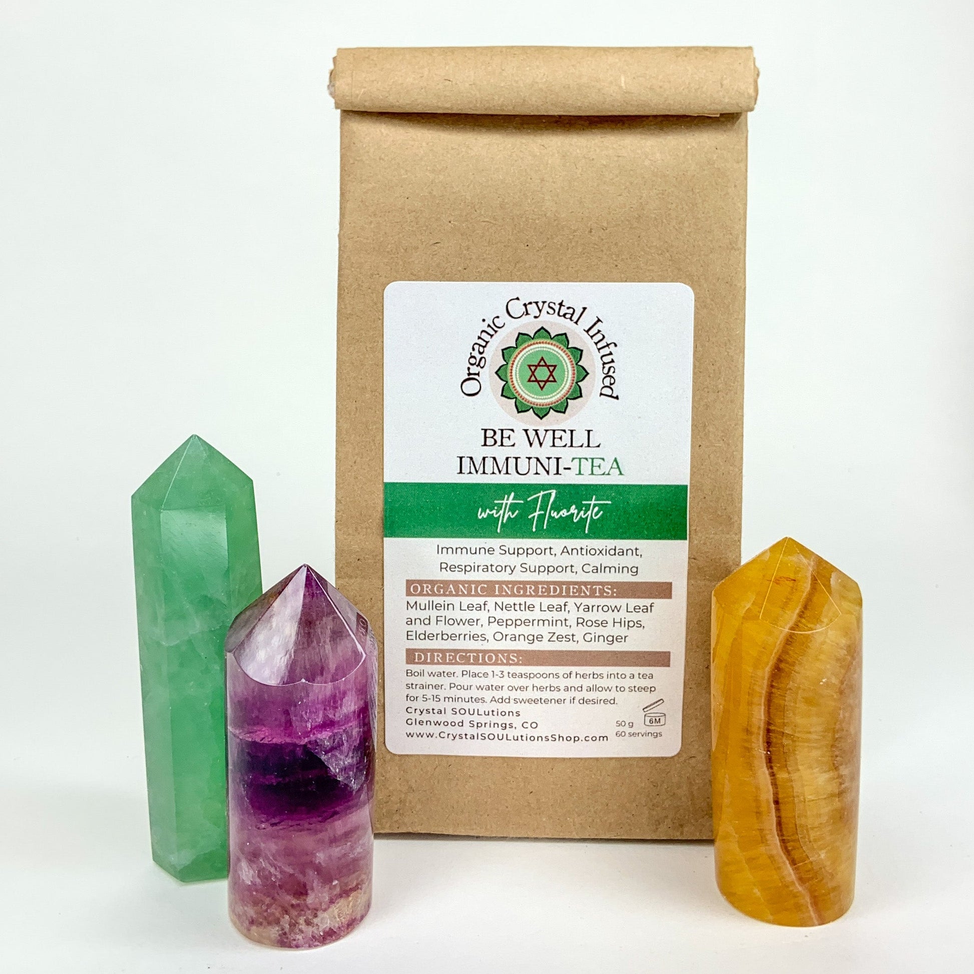 50 grams of organic loose leaf tea with the crystalline energy of Fluorite, a stone known to cleanse and clear toxins. . The health-full blend of herbs in the Be Well Immuni-Tea along with Fluorite help you to activate your natural healing abilities, soothe the emotional body, clear stress and support your physical body. Together the herbs and crystalline energy supports the various layers of your immune system and your innate healing ability.