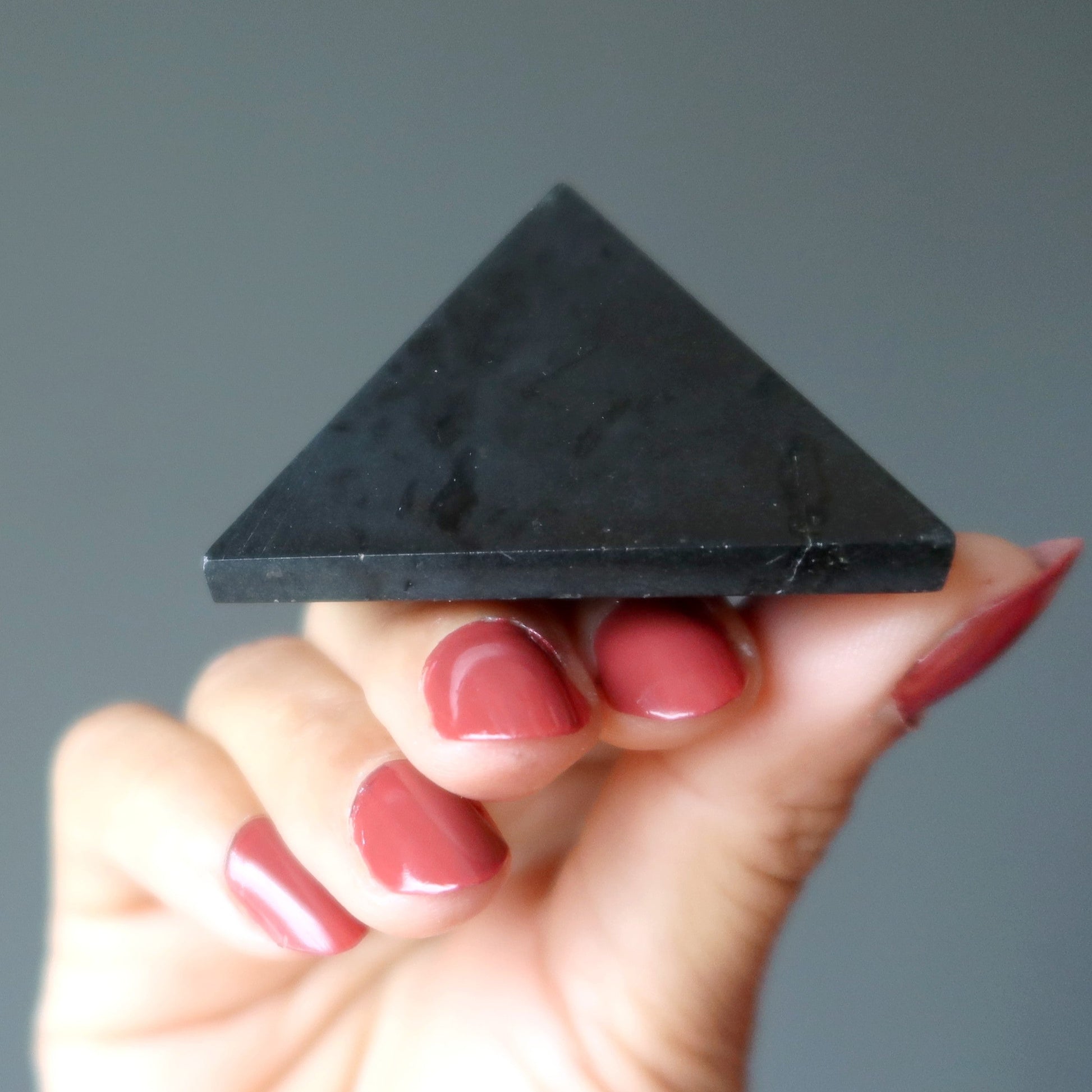 Your new pyramid features a natural and stabilized Tourmaline from India. This is a black stone with organic veins and inclusions. Each is unique. Pyramids are measured by width; height may vary.