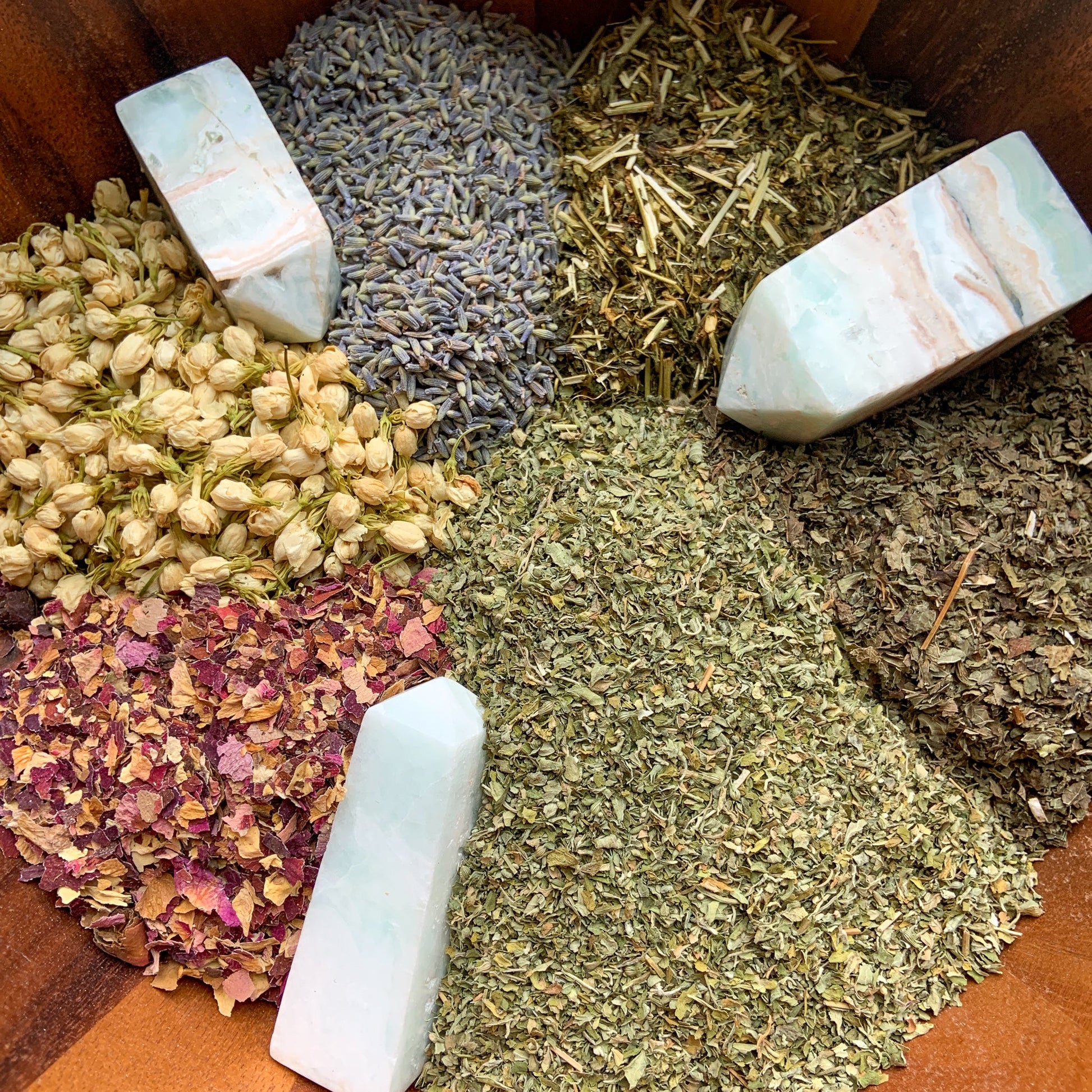 50 grams of organic loose leaf tea with the crystalline energy of Caribbean Blue Calcite, a highly intuitive and healing stone. The energetic blend of the herbs in the Inner Peace Tea along with Caribbean Blue Calcite help you to attune to the energy of oneness as well as divine wisdom and guidance. Together the herbs and crystalline energy clears and balances the third eye chakra and helps you raise your physical and energetic vibration while remaining grounded and calm.