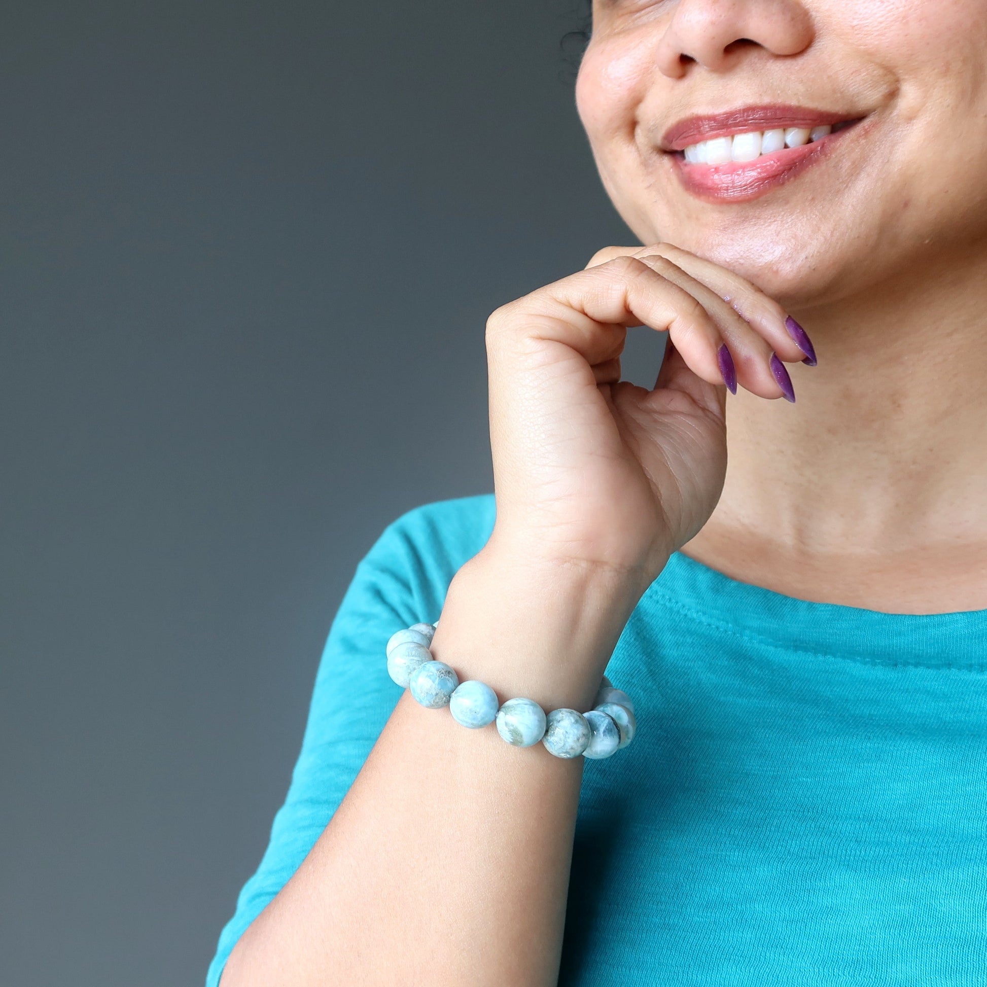 Your bracelet showcases natural and untreated Larimar from the Dominican Republic on a sturdy elastic stretch cord. The polished, roundish beads show a white and blue stone with black and brown inclusions. Each stone differs. Beaded in the Satin Crystals studio in the USA.