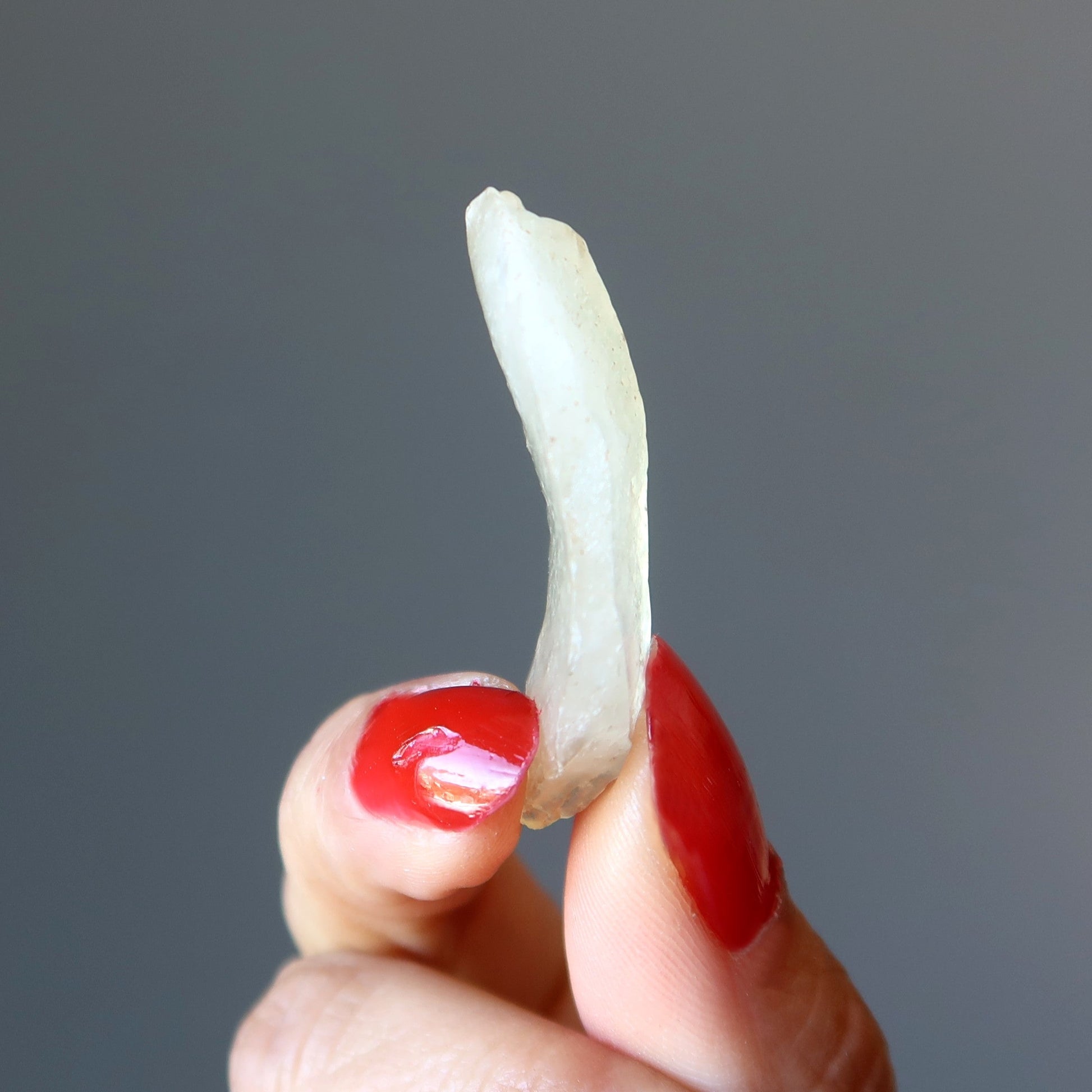 Satin Crystals' "Slim n' Sleek" Libyan Desert Glass is a thin aerodynamic shape. These are premium quality real Tektites sourced from Gilf Kebir, Egypt. Libyan Desert Glass has a glassy texture and often shows rocky minerals trapped eternally within. The thickness of your piece is between 2mm-9mm: similar to a slice or slab but with natural wavy variations.