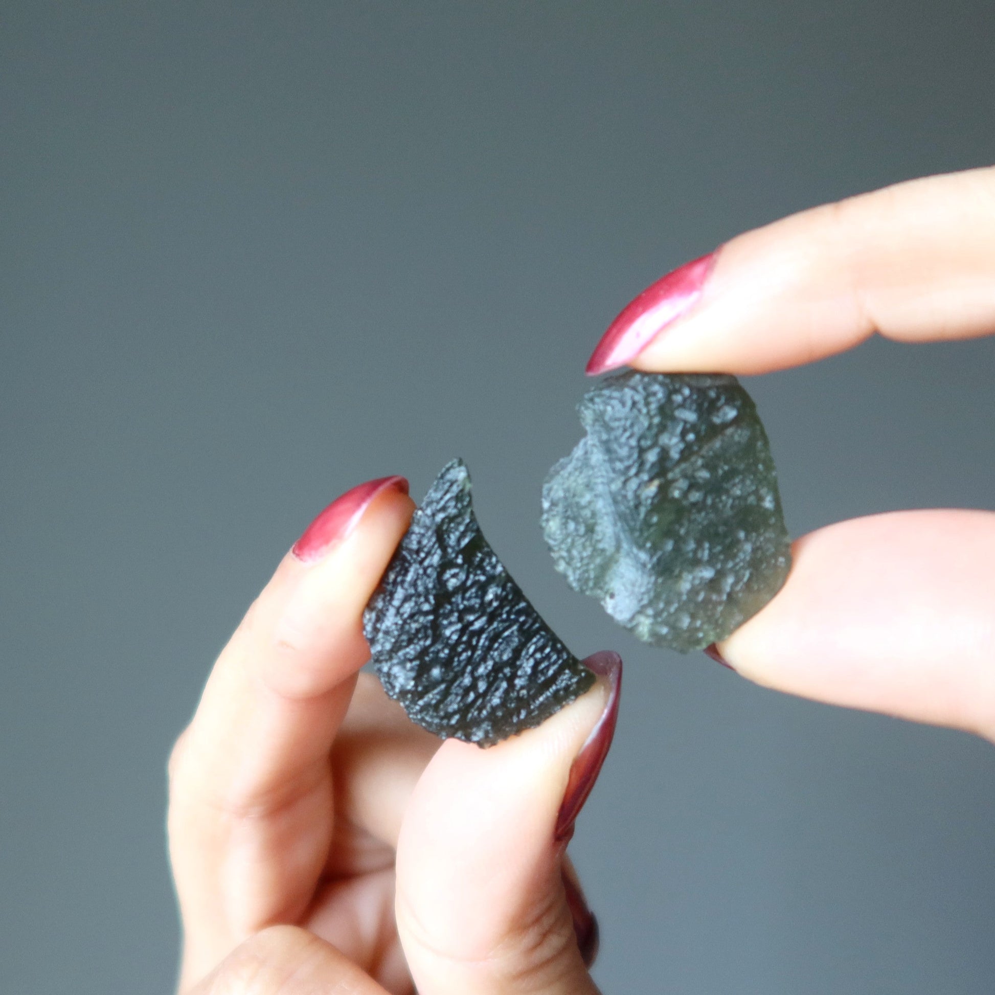 Moldavite Two Alien Friends is a pair of real green Tektites from the Czech Republic that are similar in size but different in shape. Each set will be unique, as will each piece ranging from light to dark green.