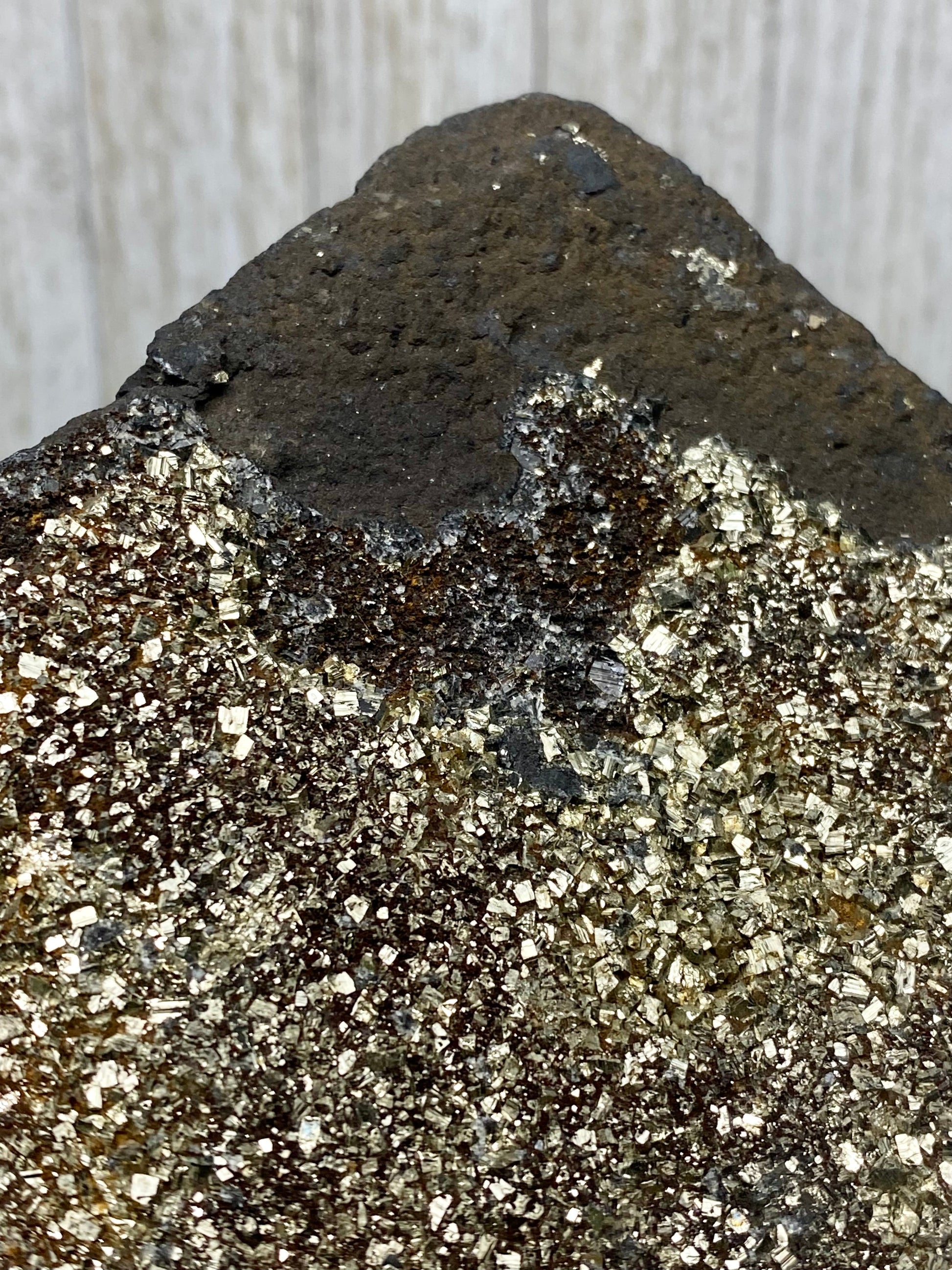 This new find from Brazil has stunningly lustrous cubic pyrite layered on carbon-heavy Shungite. This combination has great contrast between the shining gold and matte black of the two minerals.