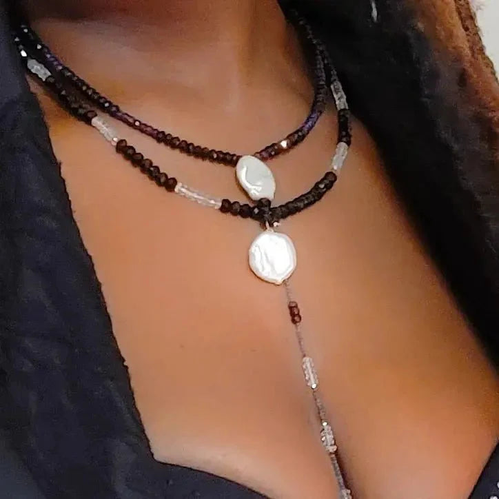 The sizzling color of these sapphires and topaz highlights what makes this piece really special. These stones are set in high quality faceted onyx. It is finished off beautifully with a 3mm natural blue diamonds, one of my favorite stones. It is a two-stranded beaded necklace with a short sapphire length on top and a longer onyx length on the bottom.