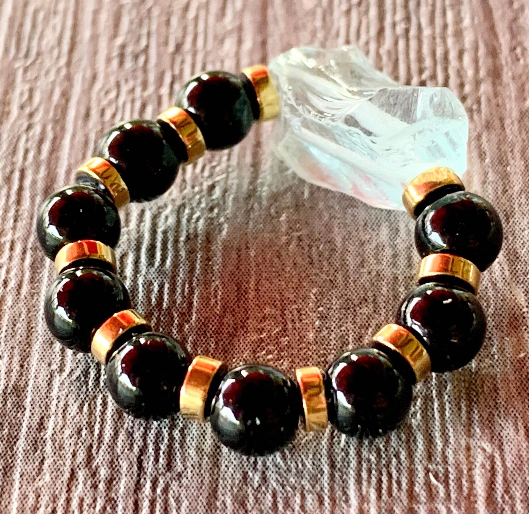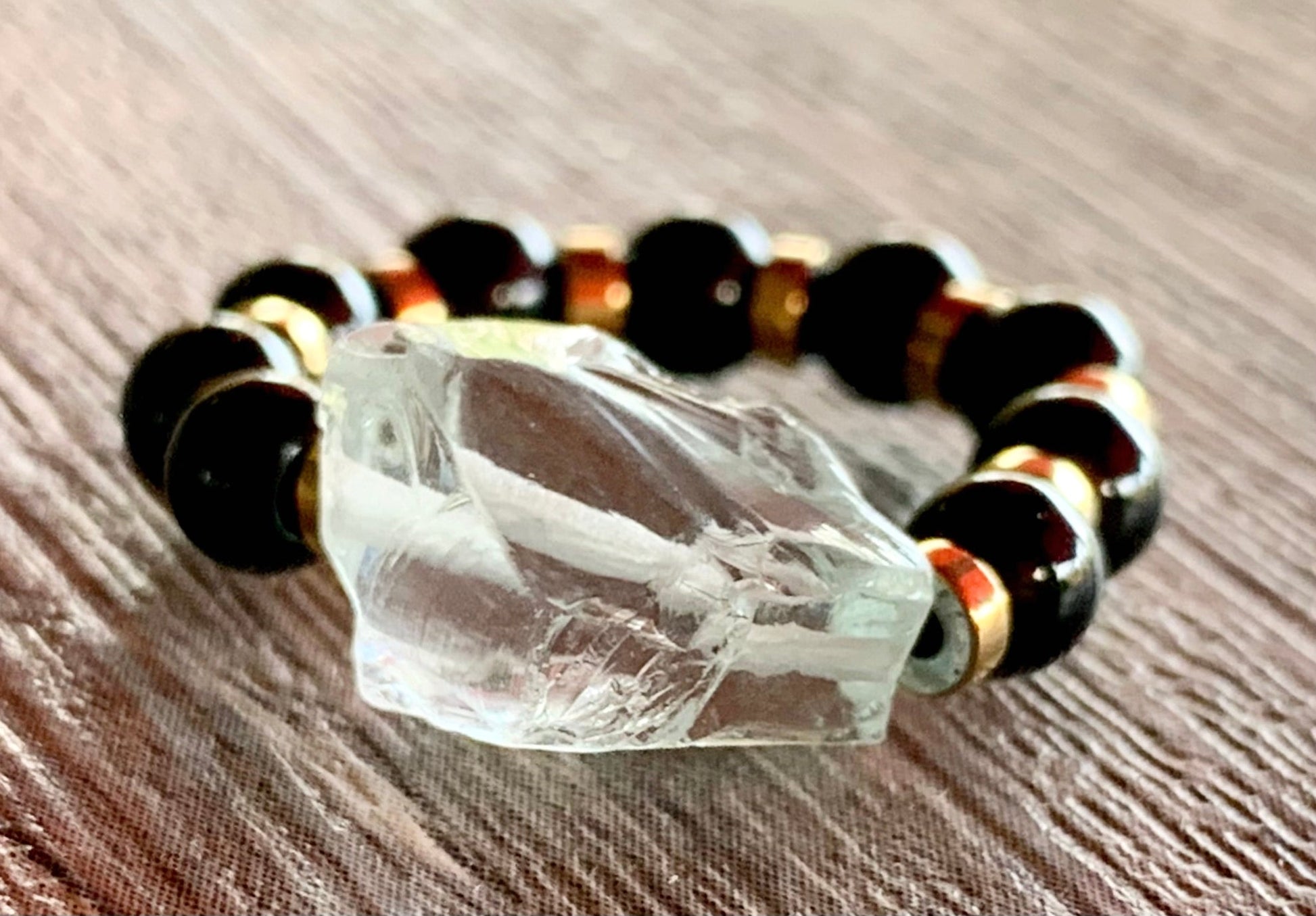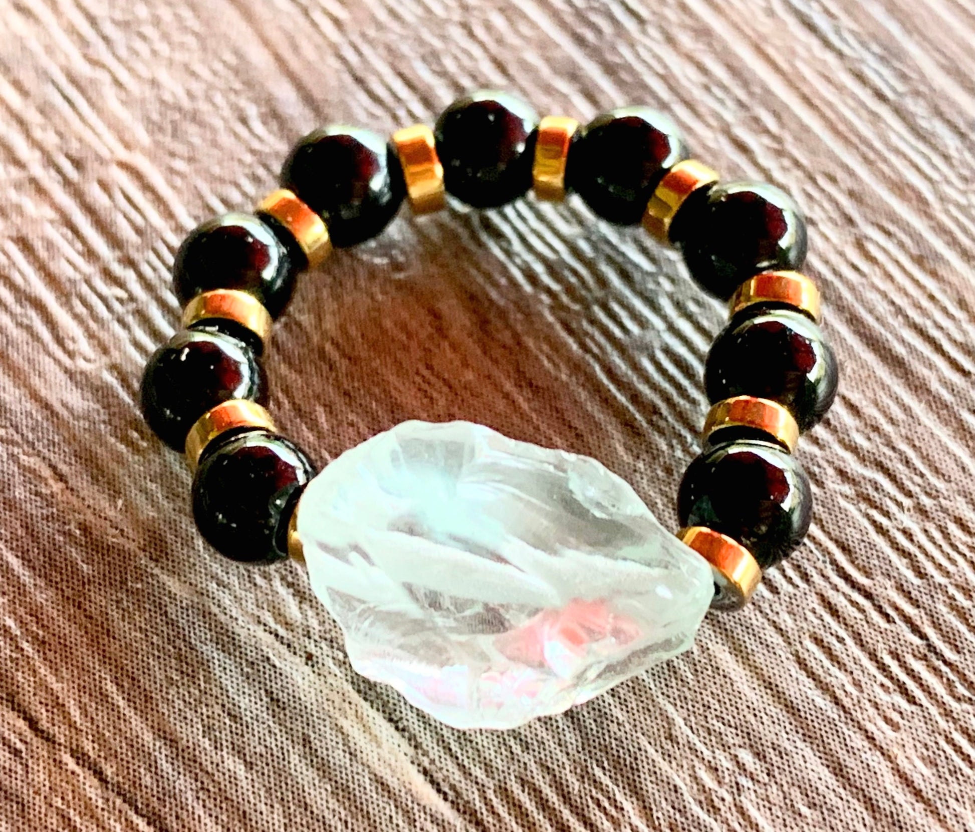 Zaida Handmade Light Blue Topaz, Black Tourmaline, and Gold Hematite Expandable Ring.